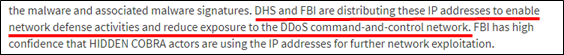 “국토안보부와 연방수사국은 네트워크 방어 활동을 활성화하고 디도스 명령 및 제어 네트워크에 노출되는 상황을 줄이기 위해 북한 사이버 작전에 이용되는 IP 주소를 공개한다.”