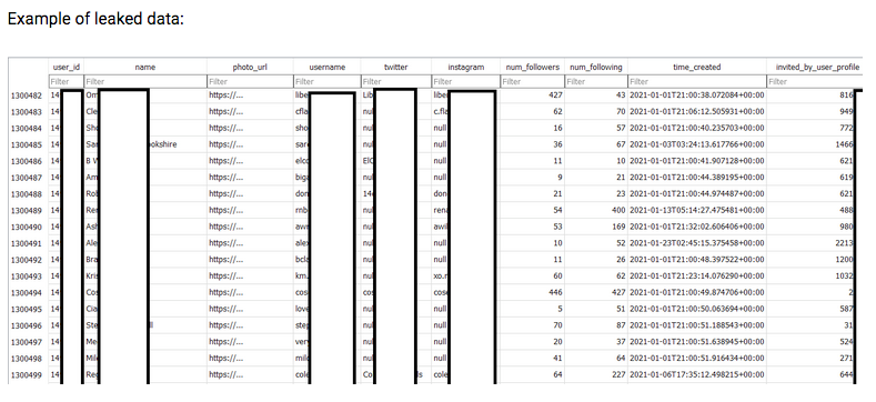 링크드인과 페이스북이 빗스한 유출 피핼르 본지 며칠 만에 13만 클럽하우스 이용자들의 개인정보가 담긴 SQL 데이터 베이스가 온라인을 통해 유출되었다.