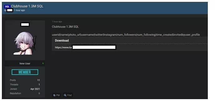 온라인으로 유출된 1.3 만명의 클럽하우스 사용자 개인 데이터가 공개되었다.