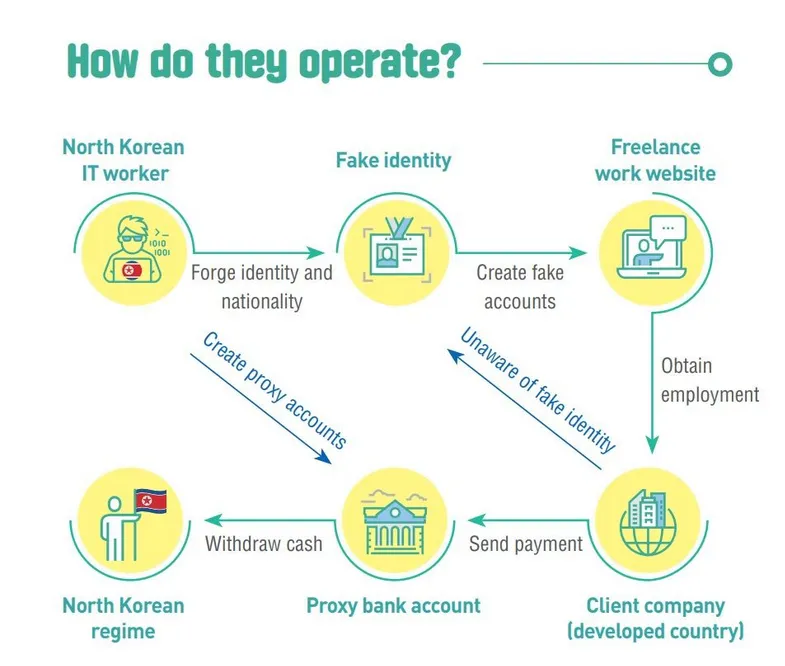 ⓛ 신원 도용 및 서류 조작(공문서 위조) : IT 노동자 들이 미국 시민 70명 이상의 신원을 도용하여 실리콘 벨리 기술 기업, 항공우주 및 방산 회사, 자동차 회사 및 제조사, 대형 미디어사 등 해당 원격 직무에 지원할 수 있도록 하였으며 원격 근무 직책을 확보하고 미 국토안보부(DHS)와 미 국세청(IRS) , 미 사회보장국(SSA)에 허위 보고 및 허위 문서를 제출하였다.